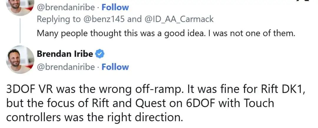 日前,布伦丹·艾瑞比在X主动@了卡马克,并表示由卡马克主导的三自由度头显Oculus Go并不是一个好主意。“很多人认为这是一个好主意,但不包括我。”他如是写道,并补充道六自由度才是正确的方向。